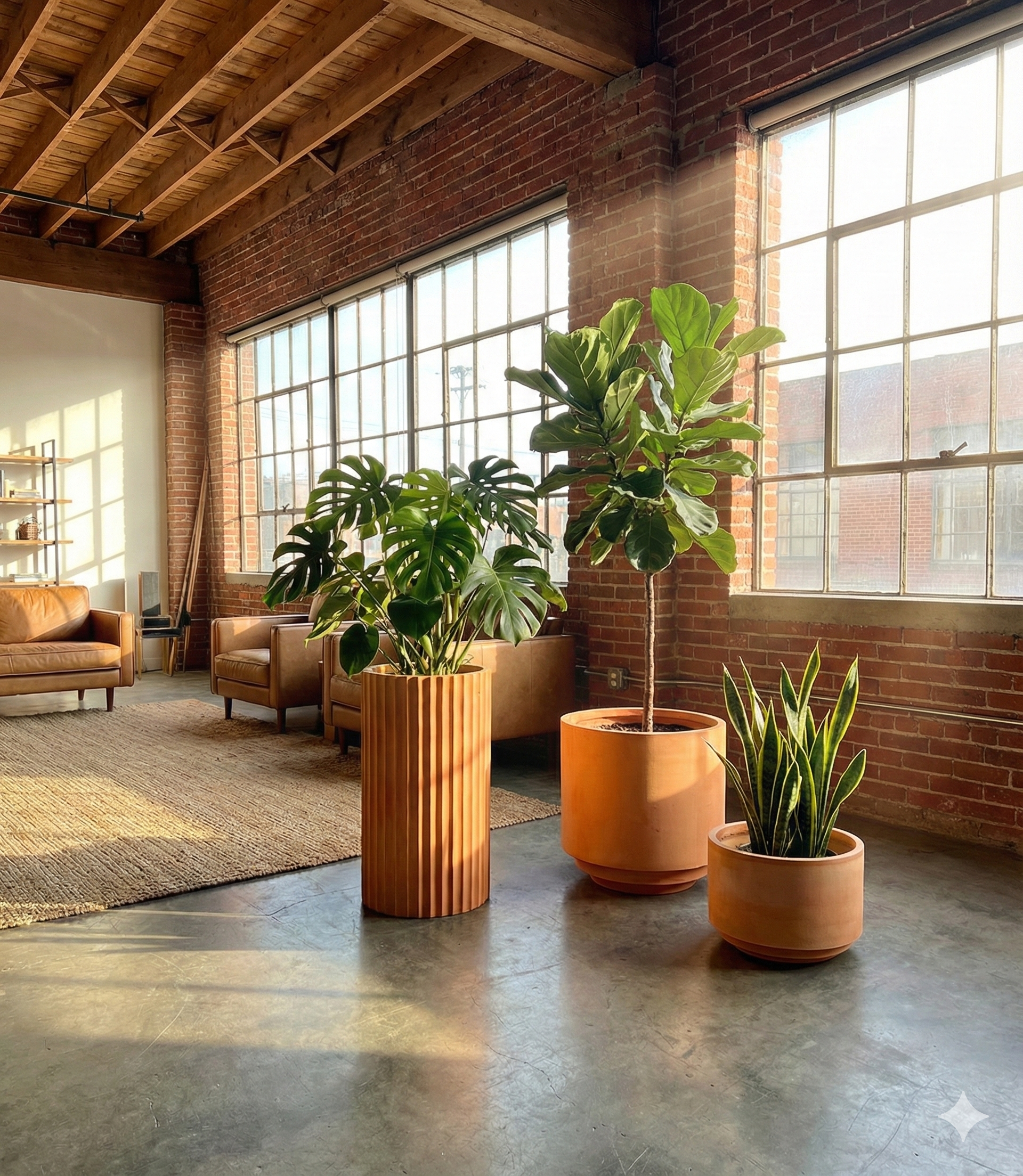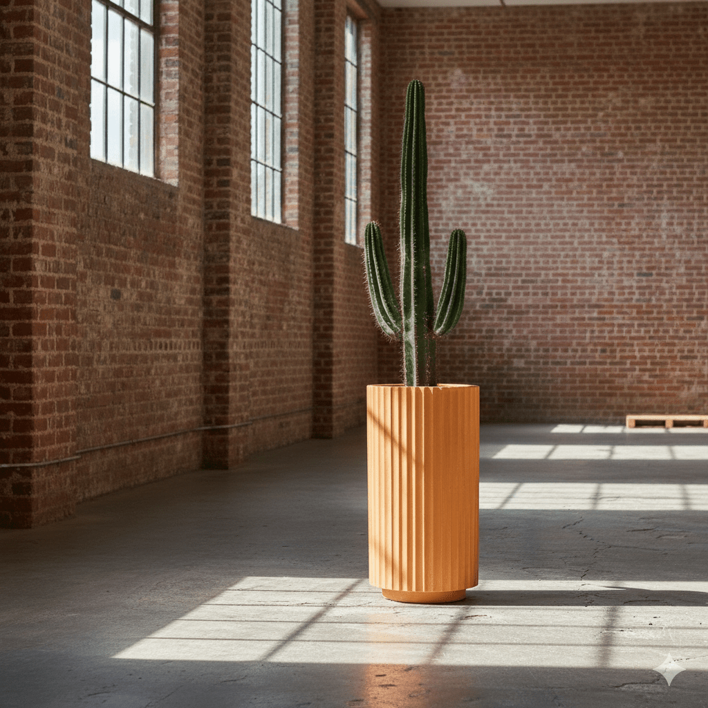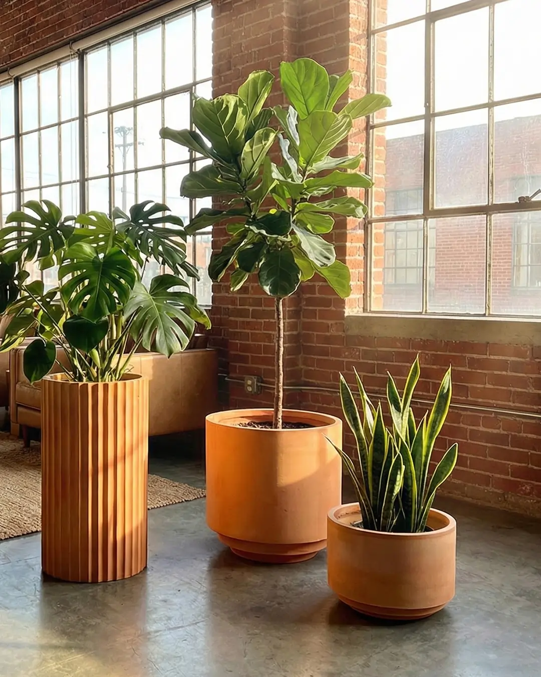 A contemporary Terracotta planter set, inclusive of one fluted, one low-profile, and one tall pot finished in an earthy modern aesthetic